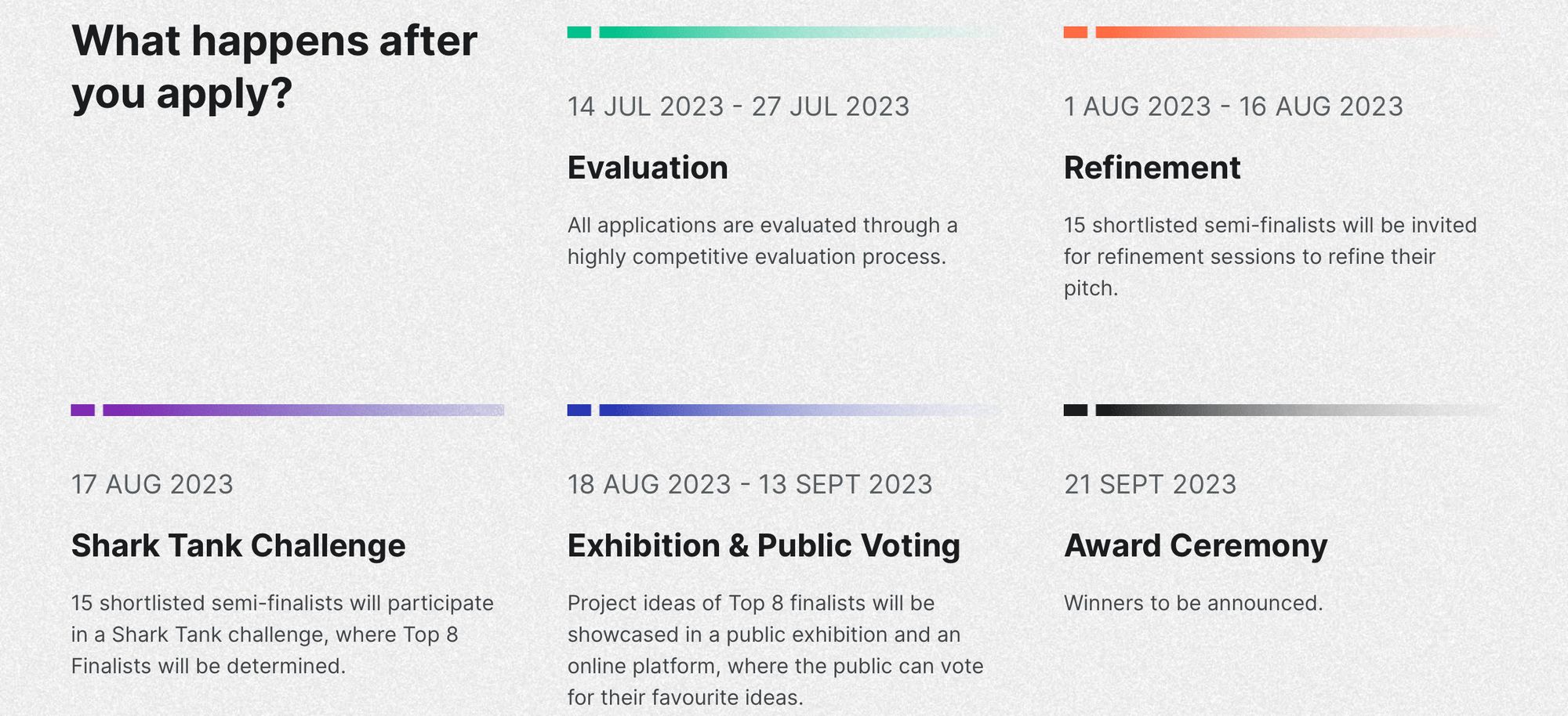- Refinement (1st - 16th August 2023): If your idea stands out, you will be among the fifteen shortlisted semi-finalists invited to refine your pitch and breathe life into your concept.