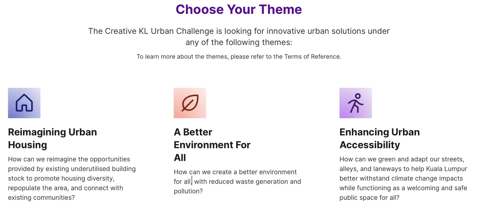 The Creative KL Urban Challenge offers you the freedom to choose from three compelling themes. Dive into the realm of Reimagining Urban Housing, where dormant buildings can be reborn as vibrant hubs, fostering housing diversity and connecting communities. Alternatively, embark on the journey to create A Better Environment For All, finding innovative ways to reduce waste generation and pollution, ensuring a sustainable future for everyone. Lastly, take up the challenge of Enhancing Urban Accessibility, transforming Kuala Lumpur's streets, alleys, and laneways into green, resilient spaces that welcome all and withstand the impacts of climate change. The choice is yours, and the possibilities are boundless.