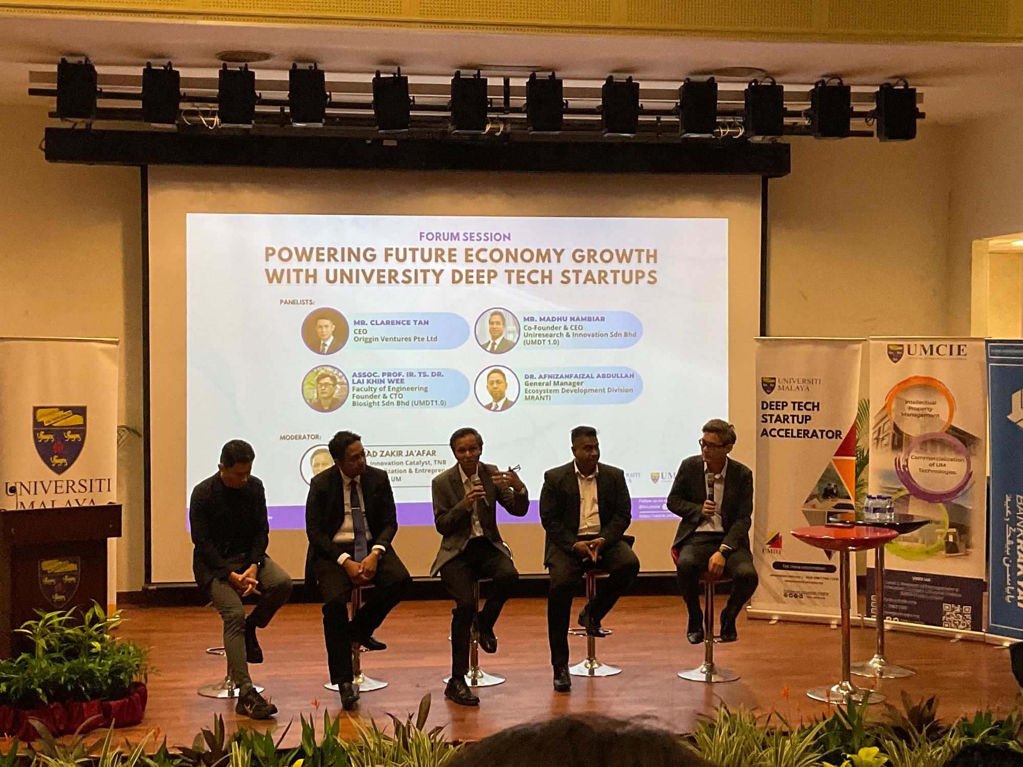The session continues with a forum session titled "Powering Future Economy Growth With University Deep Tech Startups" moderated by Ahmad Zakir Jaβafar, Senior Innovation Catalyst, TNB Commercialisation & Entrepreneur In Residence at UM. Distinguished panelists including Clarence Tan from Origgin Ventures Pte Ltd, Madhu Nambiar, co-founder and CEO of Uniresearch&Innovation Sdn Bhd (UMDT 1.0), Assoc. Prof. Ir. Ts. Dr. Lai Khin Wee, the founder and CTO of Biosight Sdn Bhd (UMDT 1.0), and Dr. Afnizanfaizal Abdullah, General Manager of the Ecosystem Development Division at MRANTI, have shared their expertise and insights on the potential of deep tech startups in driving future economic growth.