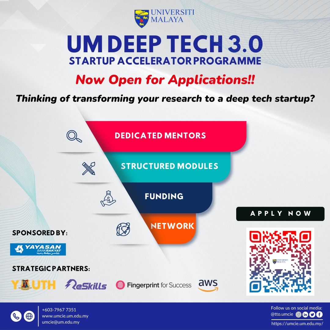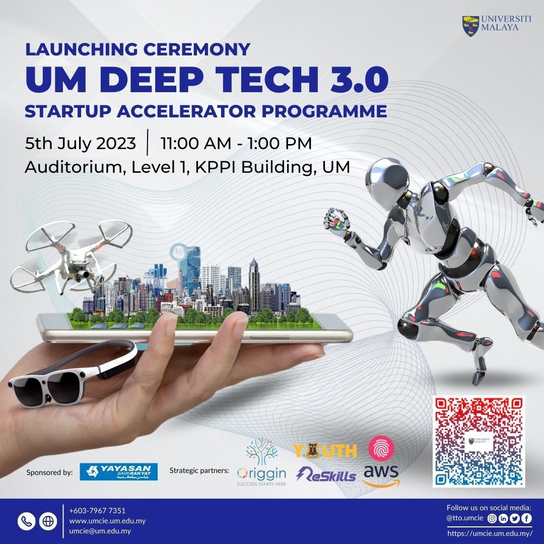 University Malaya via the Universiti Malaya Centre of Innovation and Enterprise (UMCIE) launched its UM Deep Tech (UMDT) Startup Accelerator Program 3.0 on July 5th, 2023. This event is an inspiring and informative session that shed light on the groundbreaking technologies and innovations developed by university startups and their impact on shaping the future of our economy.